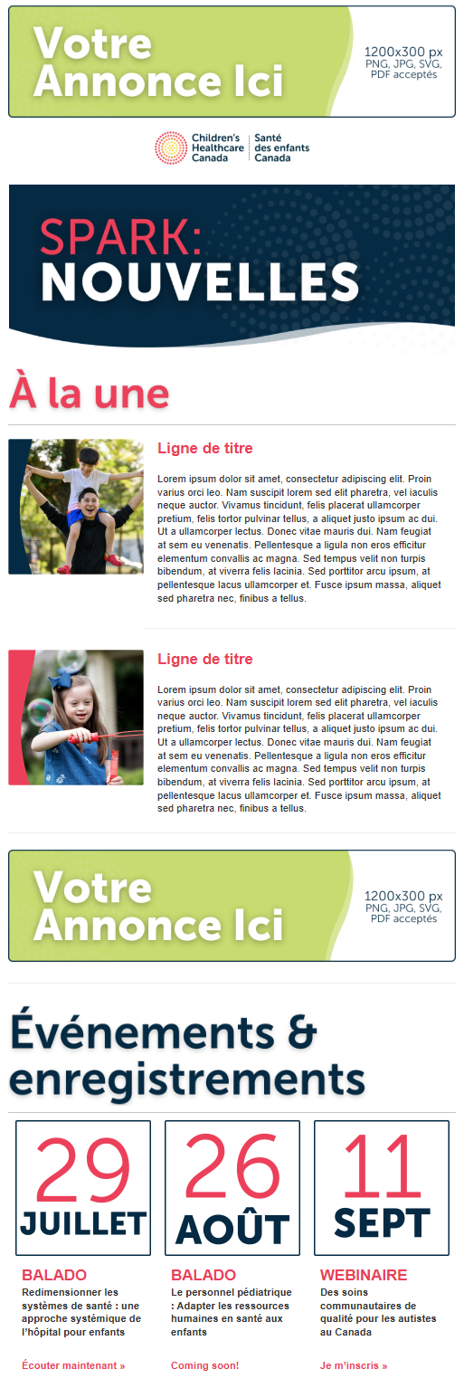 Grâce à un réseau diversifié de membres, notamment des hôpitaux, des centres de réadaptation, des fournisseurs de soins à domicile et à une bonne collaboration avec plusieurs partenaires,nous offrons l’opportunité d'entrer en contact avec des décideurs et des personnes d'influence qui se consacrent à l'avancement de la santé des enfants. Que ce soit par le biais de nos plateformes numériques, de nos publications ou de nos événements, nos options publicitaires sur mesure vous aident à mettre en valeur votre marque et à amplifier votre impact.