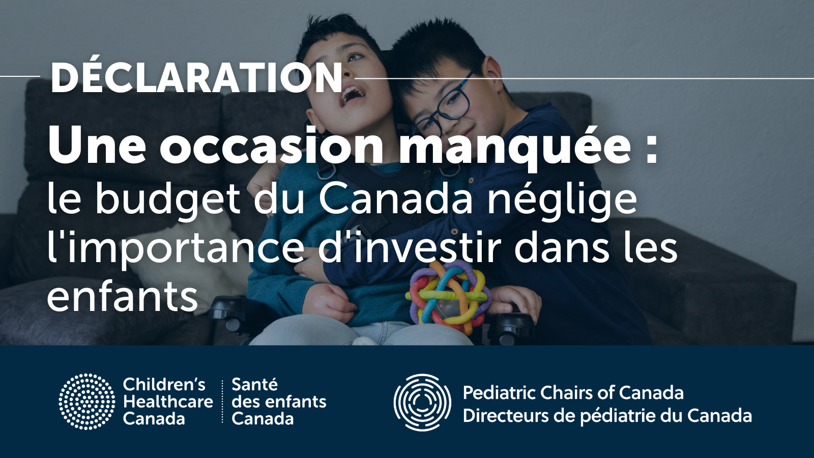 Santé des enfants Canada (SEC) et les Directeurs de pédiatrie du Canada (DPC) saluent l'engagement continu du gouvernement envers le programme alimentaire scolaire national et les services de garde abordables. Cependant, ceux qui travaillent à fournir des services de santé essentiels aux enfants et aux jeunes à travers le pays continuent d'attendre les investissements nécessaires pour moderniser les soins pédiatriques et améliorer les résultats pour plus de huit millions d'enfants.