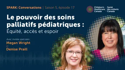 Les soins palliatifs pédiatriques vont bien au-delà du soutien en fin de vie : il s'agit d'accompagner les enfants et leurs familles depuis le diagnostic jusqu'à la gestion des symptômes, le deuil et au-delà. Dans cet épisode de SPARK : Conversations, la Dre Katharine Smart s'entretient avec Megan Wright (Roger Neilson Children's Hospice) et Denise Praill (Canuck Place Children's Hospice) sur ce qu'il faut faire pour adapter les systèmes de soins palliatifs pédiatriques à l'échelle du Canada, améliorer l'équité et l'accès, et soutenir les familles et les prestataires de soins dans les moments les plus difficiles.